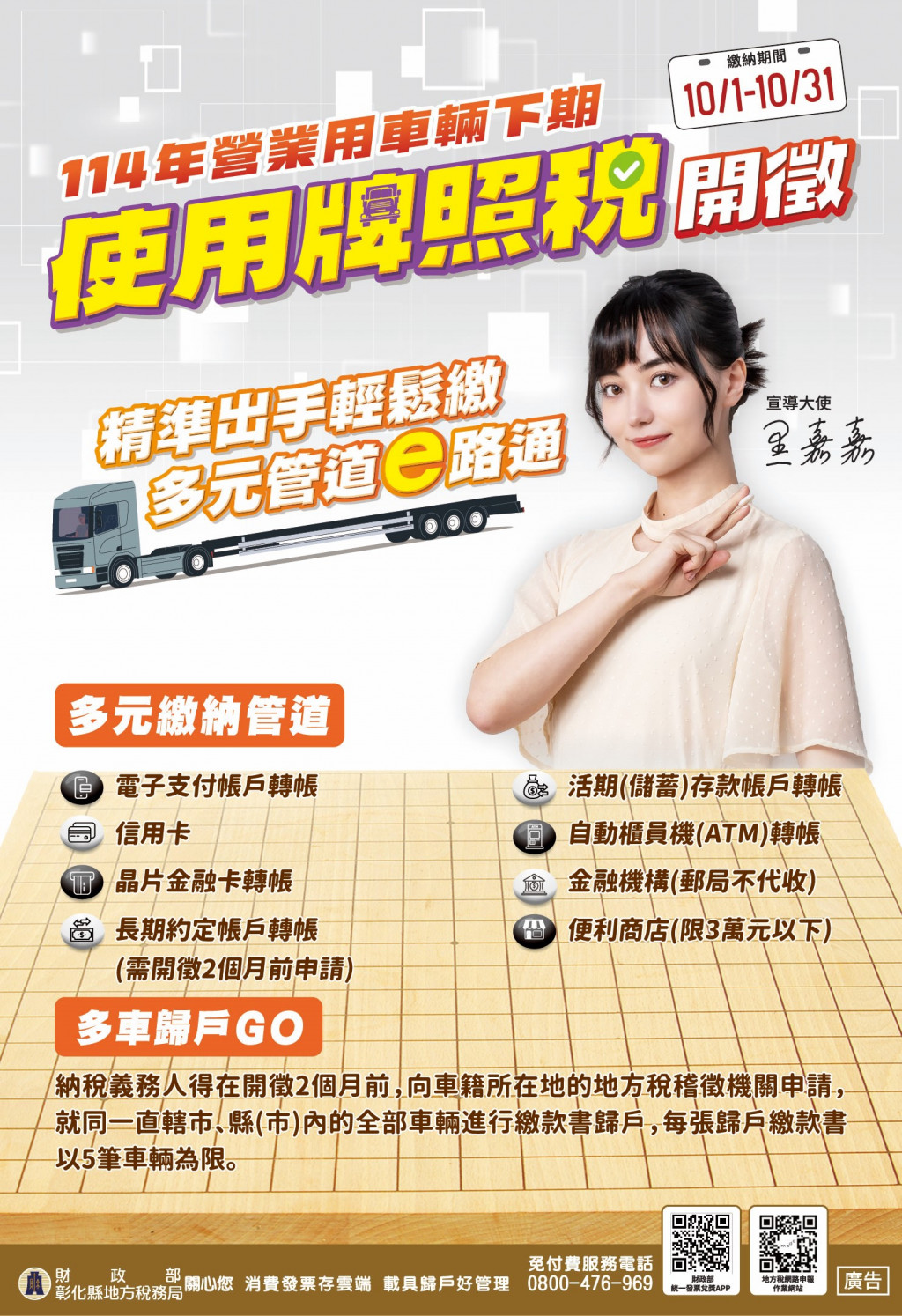 (二) | 託播內容:114年營業用車輛下期使用牌照稅於10月開徵,繳納期間自10月1日至10月31日,請如期繳納,彰化縣地方稅務局關心您。 |