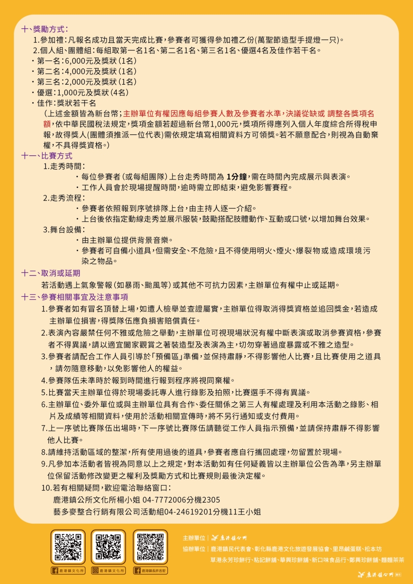 參賽者報到序號將於114年10月22日(三)公告於鹿港鎮文化所臉書粉絲專頁,敬請留意。 |