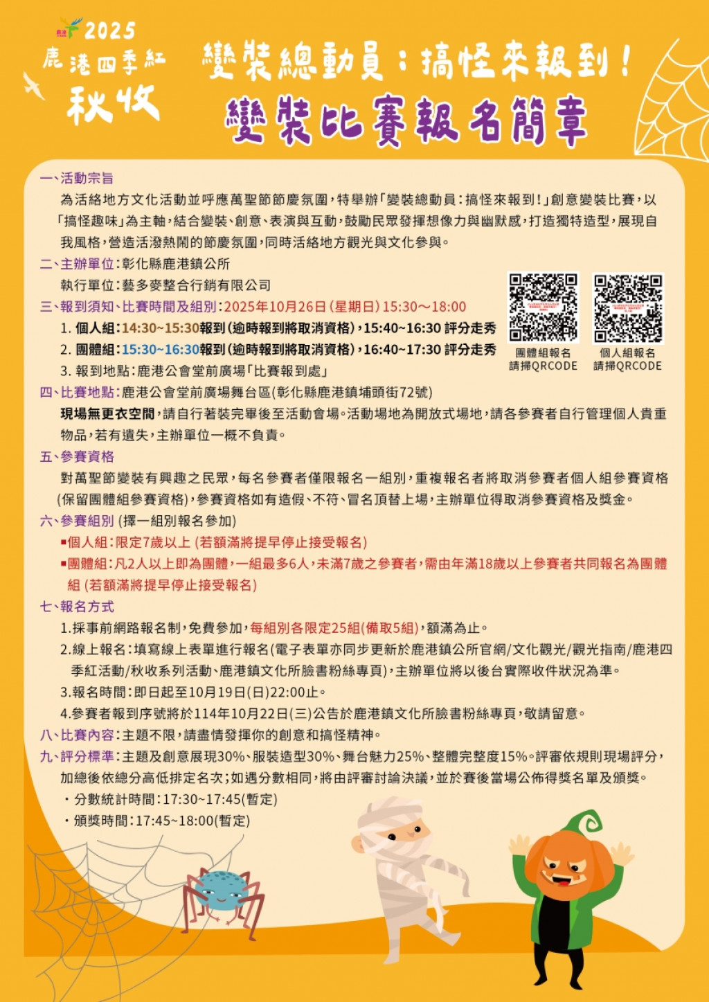 鹿港鎮公所辦理「2025鹿港四季紅秋收系列活動-『變裝總動員:搞怪來報到!』變裝比賽」,敬請協助宣傳周知,並轉轄下公私立高中、國中及小學生踴躍報名參加