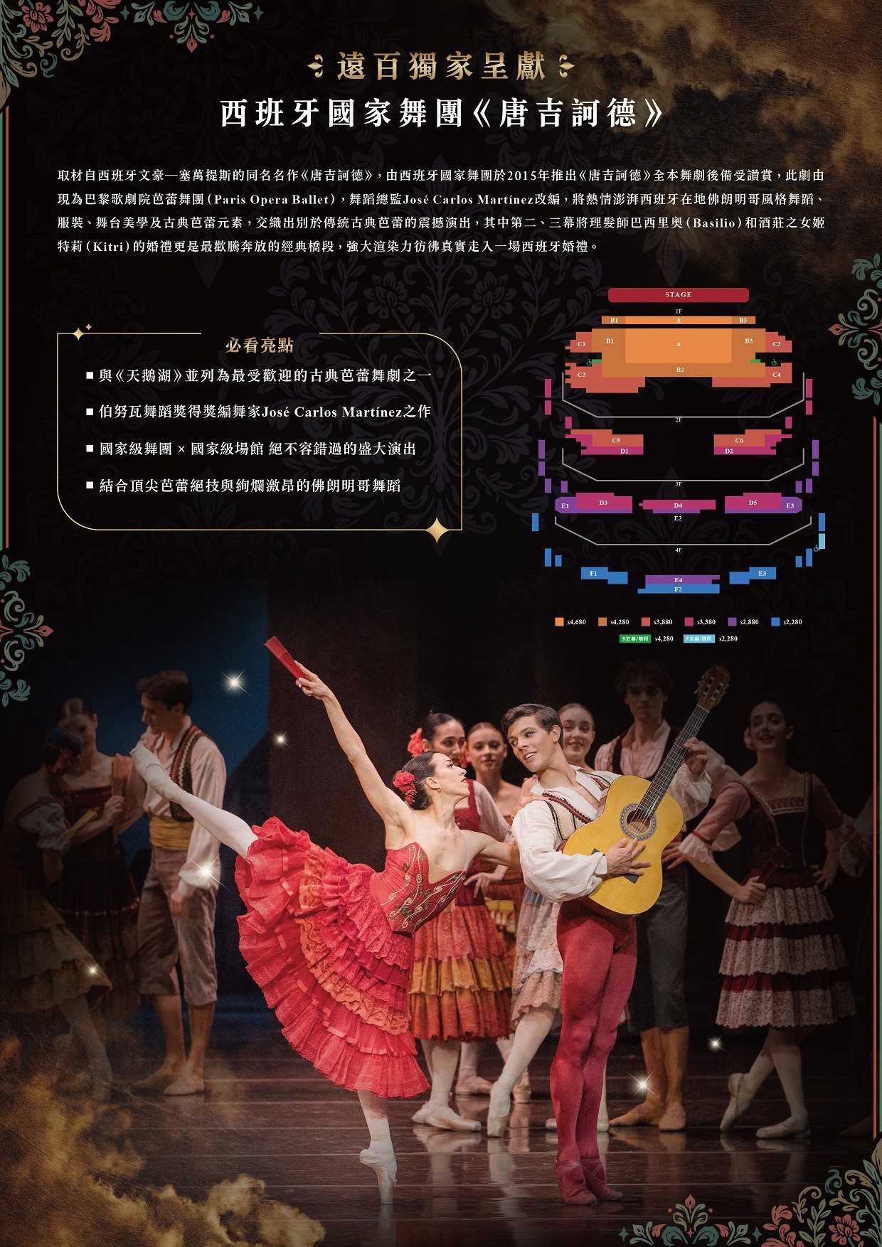 (五) 本次演出版本由現任巴黎歌劇院芭蕾舞團舞蹈總監、伯努瓦舞蹈獎(Benois de la Danse)得主 José Carlos Martínez 改編創作。Martínez 以19世紀「古典芭蕾之父」莫里斯.佩蒂帕(Marius Petipa)的經典版本為基礎,在尊重古典技術體系與結構框架的前提下,融入更鮮明的西班牙文化元素,使人物性格更加立體,並透過舞段節奏與場景轉換的流動設計,讓敘事更為緊湊而富層次。