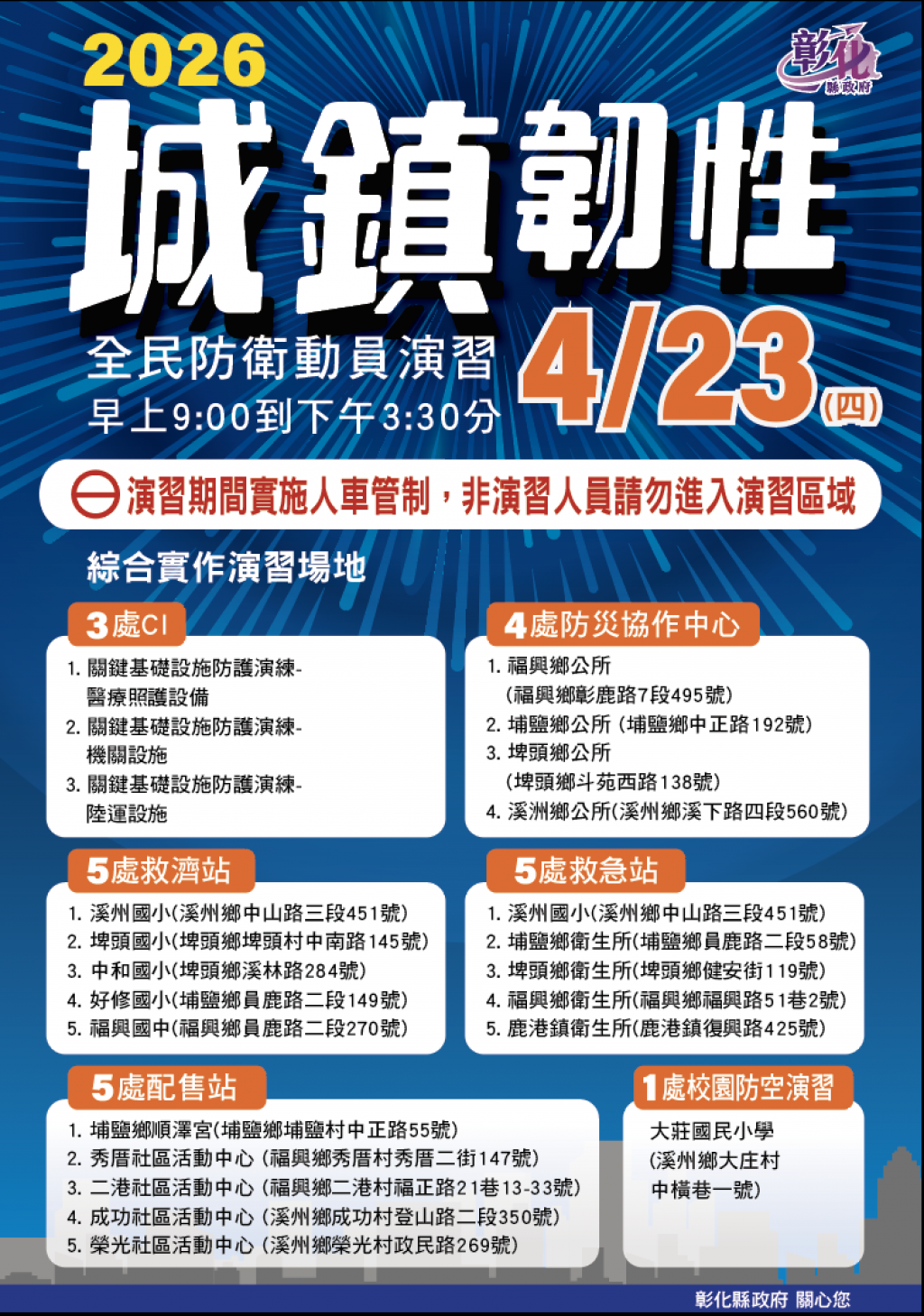 彰化縣政府訂於115年4月23日(星期四)於福興鄉、埔鹽鄉、埤頭鄉、溪州鄉等4個鄉(鎮、市)辦理彰化縣2026城鎮韌性(全民防衛動員)演習。