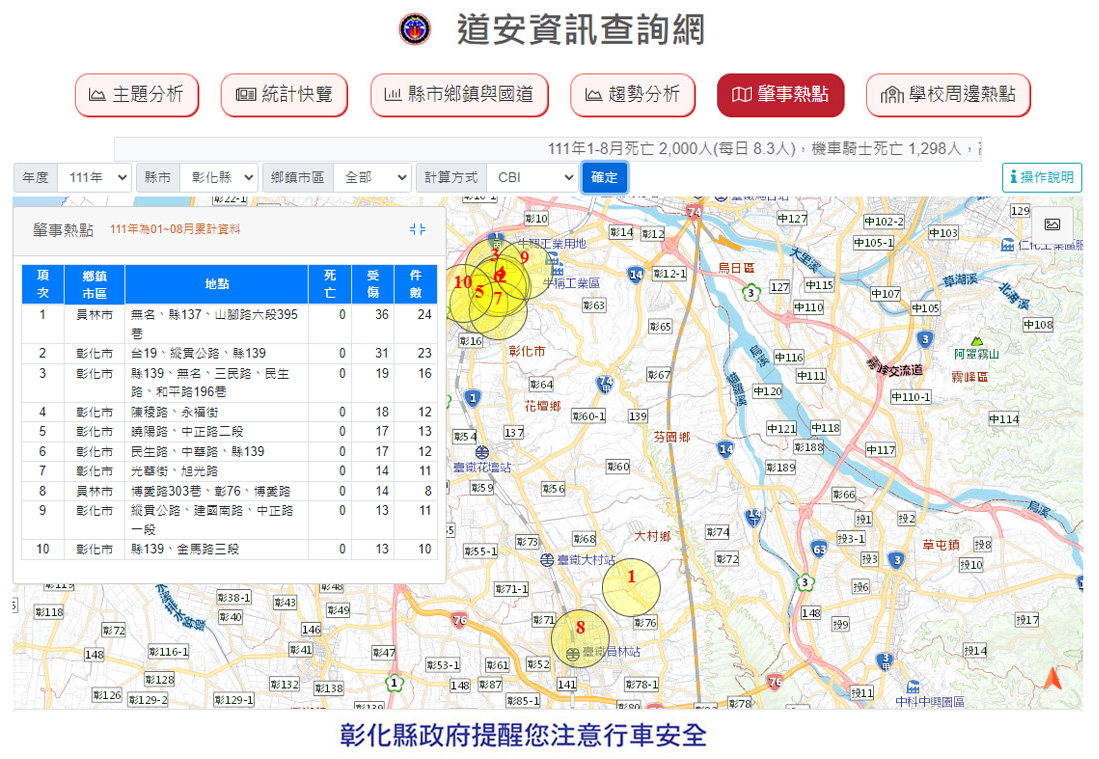 | (一) | 111年1-8月與110年同期道路交通事故比較,死亡人數增加37人,受傷人數增加2,039人,啟動自身防禦認知,遠離大型車,才能確保自身安全,彰化縣政府關心您。 |